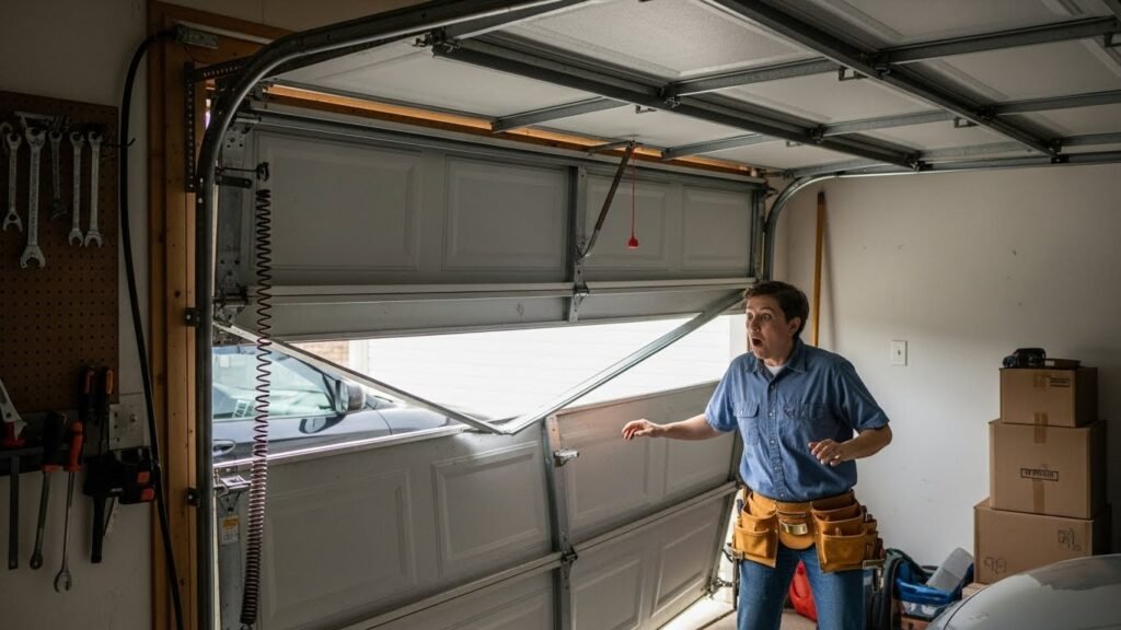- Visible broken springs or cables
